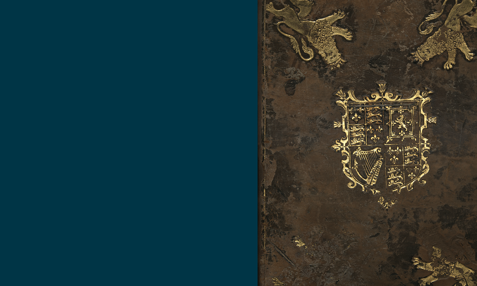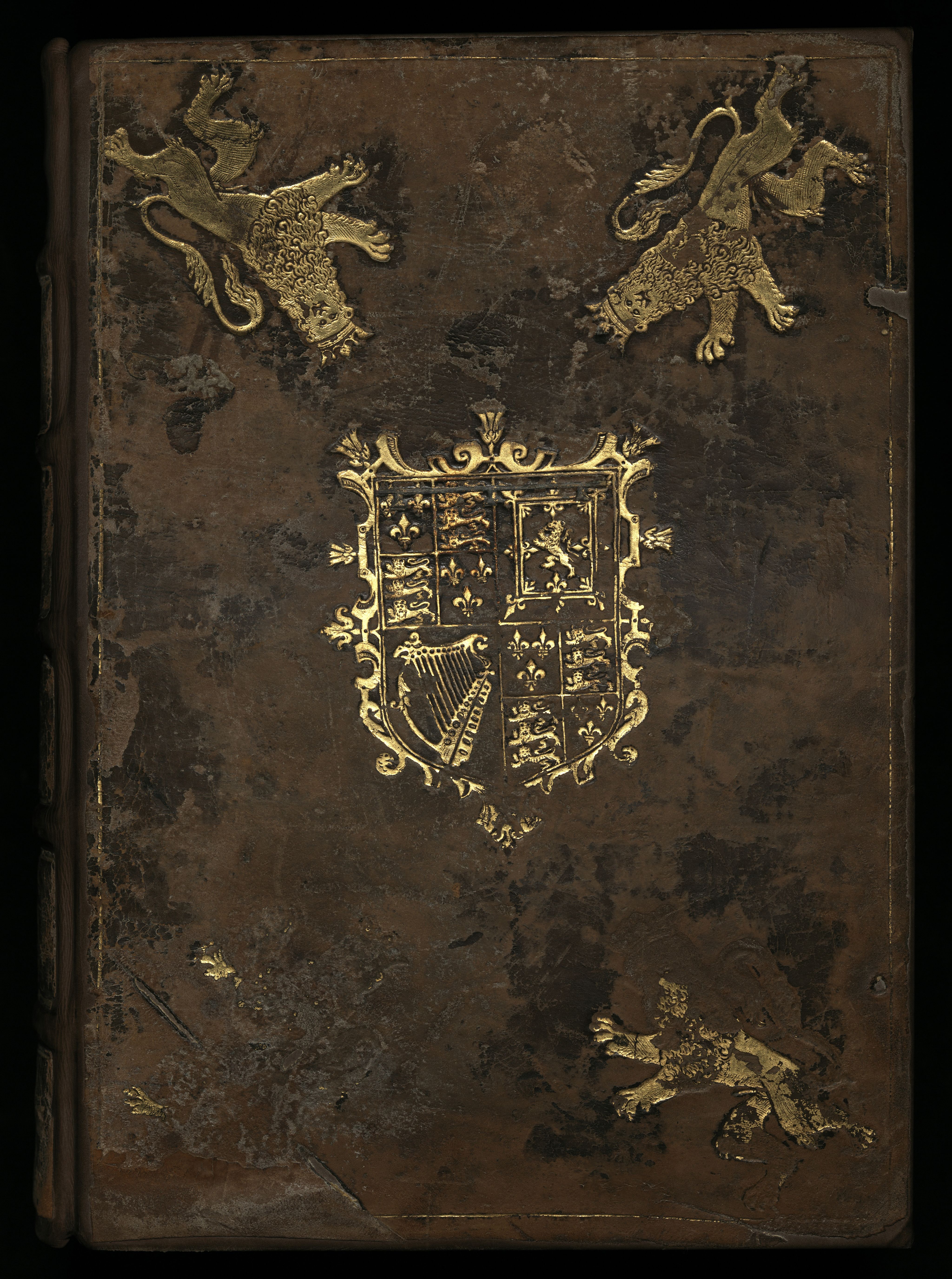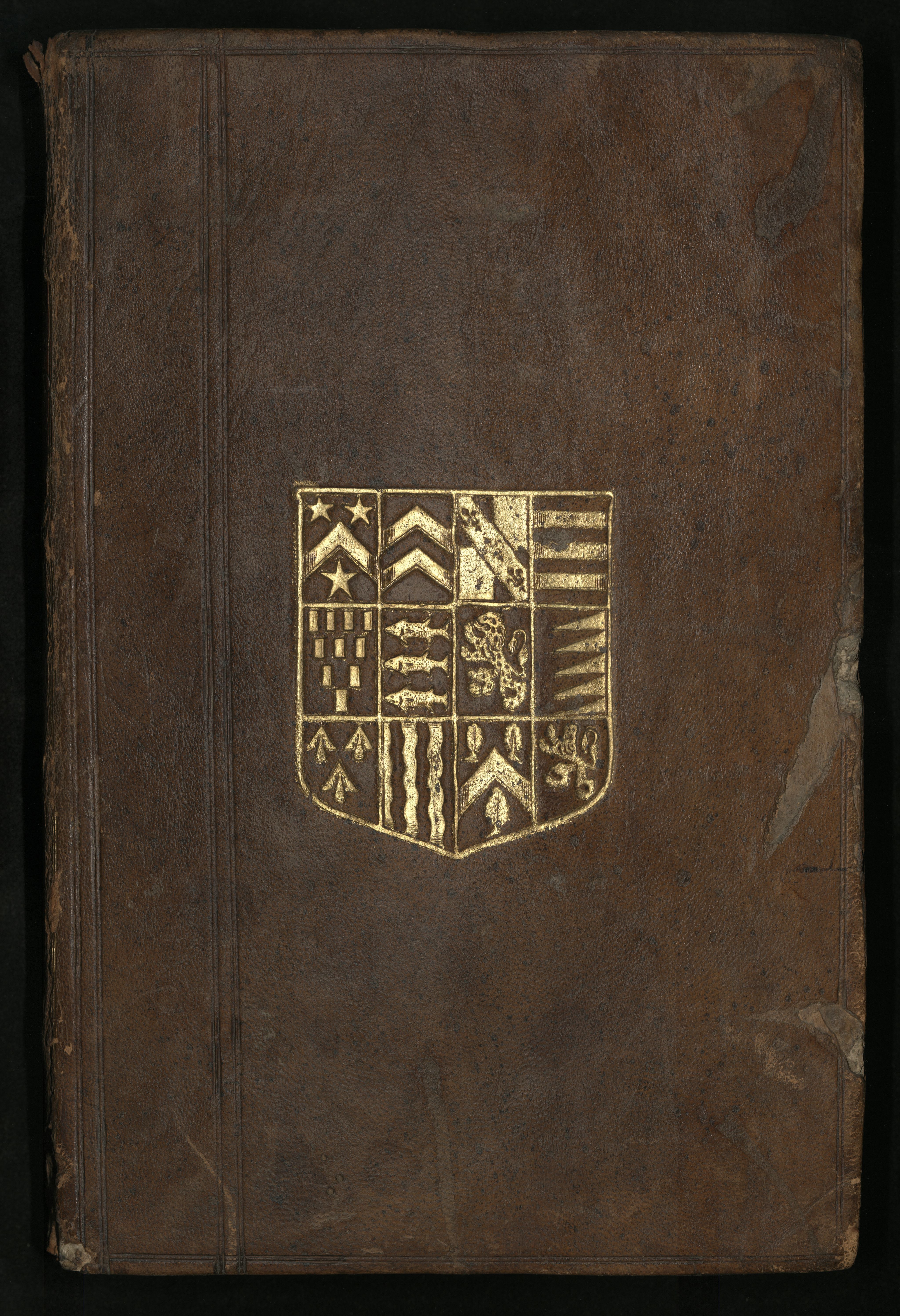 The calf binding on this mid-16th century book has the armorial stamp, in gold, of Henry Frederick, Prince of Wales. It is not necessarily evidence that the Prince of Wales previously owned the book; we need to treat the armorial binding with caution since royal arms were used simply as decoration in the 16th and 17th centuries.