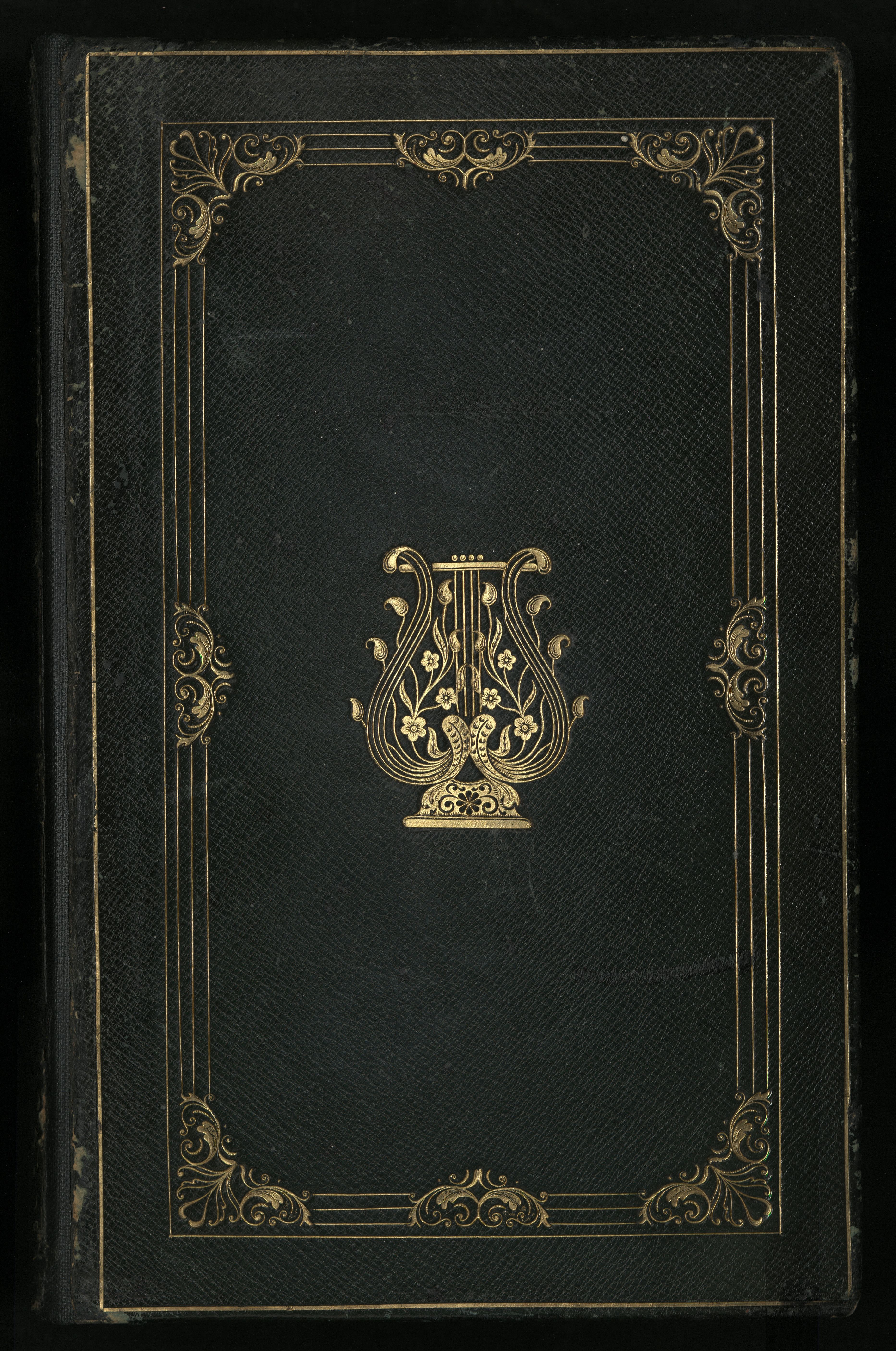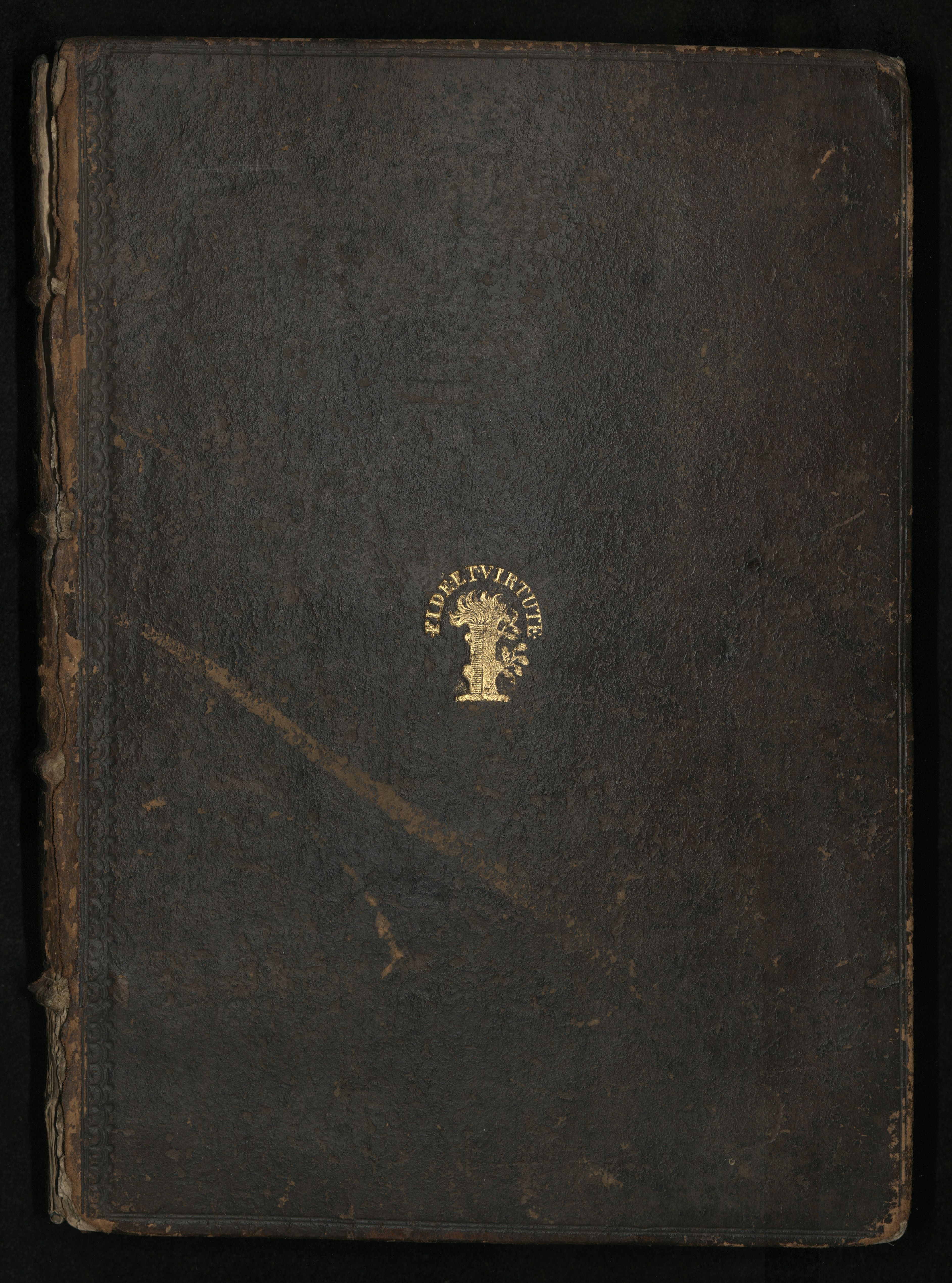 The sheep binding has the crest and motto of Charles Brandling (1733–1802), in gold, on the front board. The crest depicts a brand (burning wood) with sprays of leaves on one side and the motto Fide et virtute (Faith and courage). Brandling came from a family of wealthy merchants, land, and coal owners. He was High Sheriff of Northumberland, Member of Parliament for Newcastle and arranged Gosforth Park.