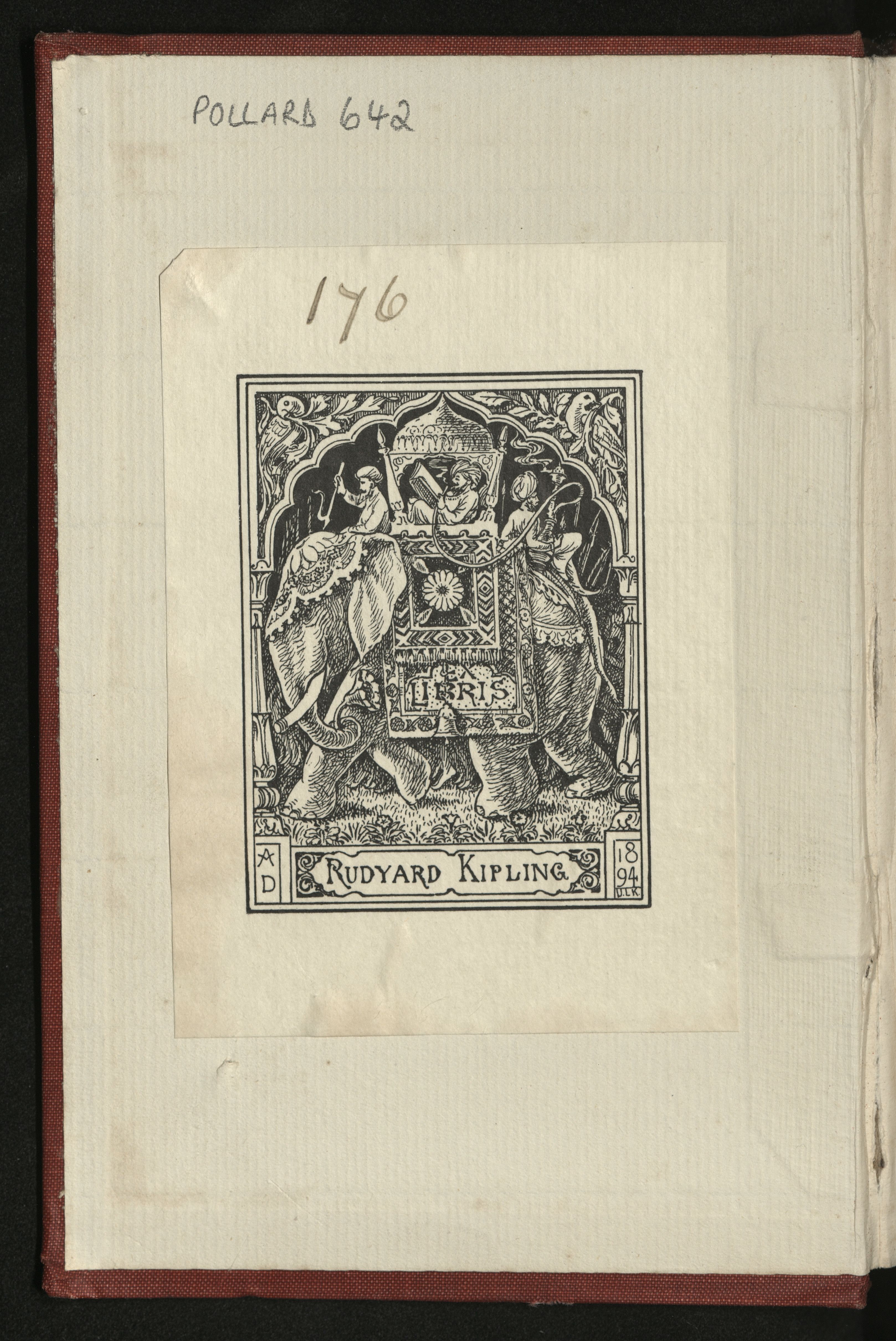 The front pastedown seen here has the pictorial bookplate of the writer Rudyard Kipling (1865–1936). Kipling would have been working for local newspapers in British India in 1894, when this Ex Libris (‘from the library of’) bookplate is dated. The bookplate was designed by his father, John Lockwood Kipling, an art teacher, and illustrator. Rudyard Kipling was one of the most popular writers in the late-19th and early-20th centuries. In 1907, he was the youngest person to win the Nobel Prize for Literature, aged 41. He took inspiration from British India and became a controversial figure as the 20th century continued and the political and social climates changed. His interpretation of the experiences of empire remains problematic.