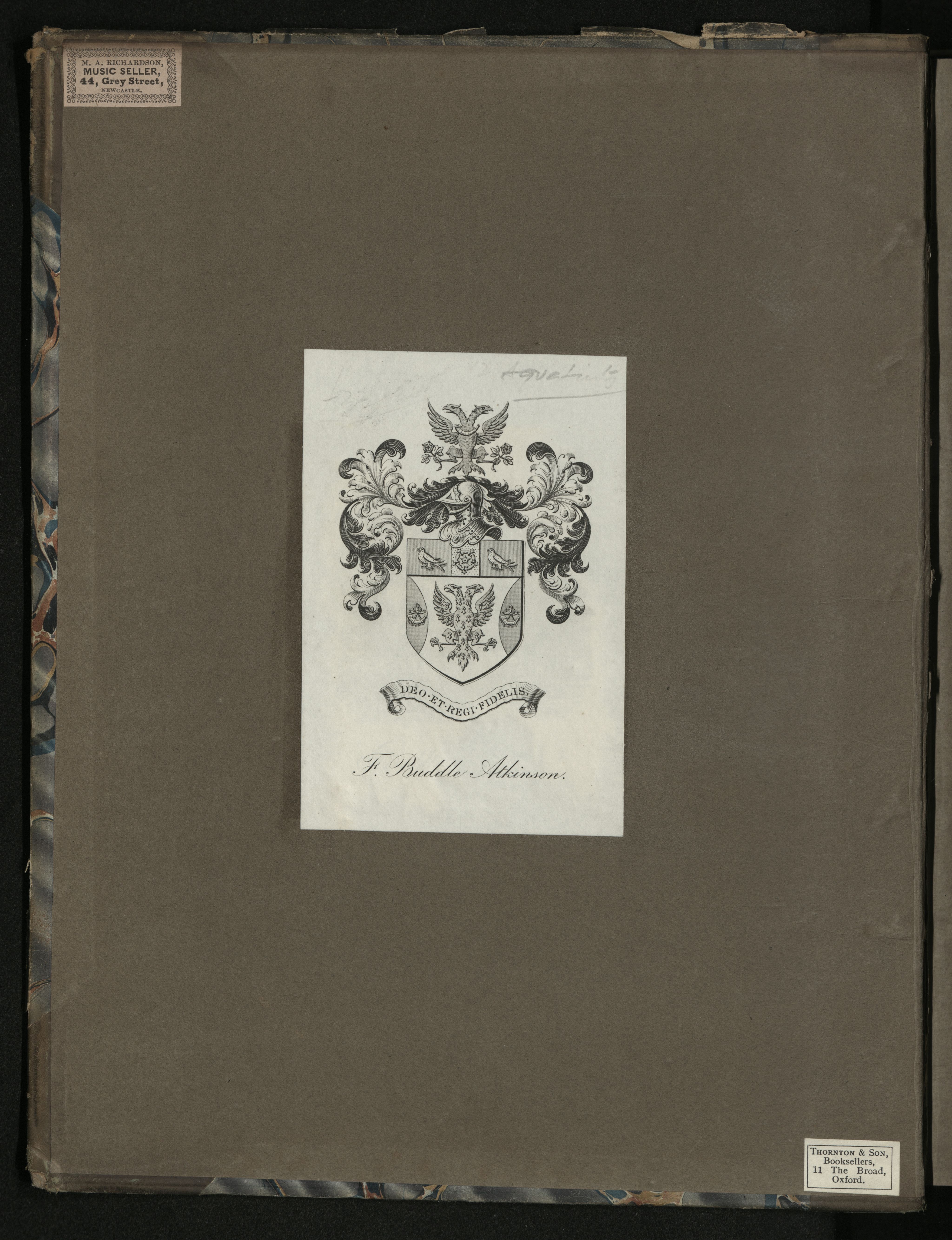 The owner of this book, identified by his armorial bookplate, was Frank Buddle Atkinson (1866–1953) of Barmoor Castle, Lowick in Northumberland. He was Director of the Hawthorne Leslie & Co. shipbuilding and locomotive engineering company, owner of the Bolam and Gallowhill estates and High Sheriff of Northumberland. On the front pastedown are the bookseller’s tickets of M.A. Richardson, Grey Street, Newcastle, and Thornton & Son, The Broad, Oxford.