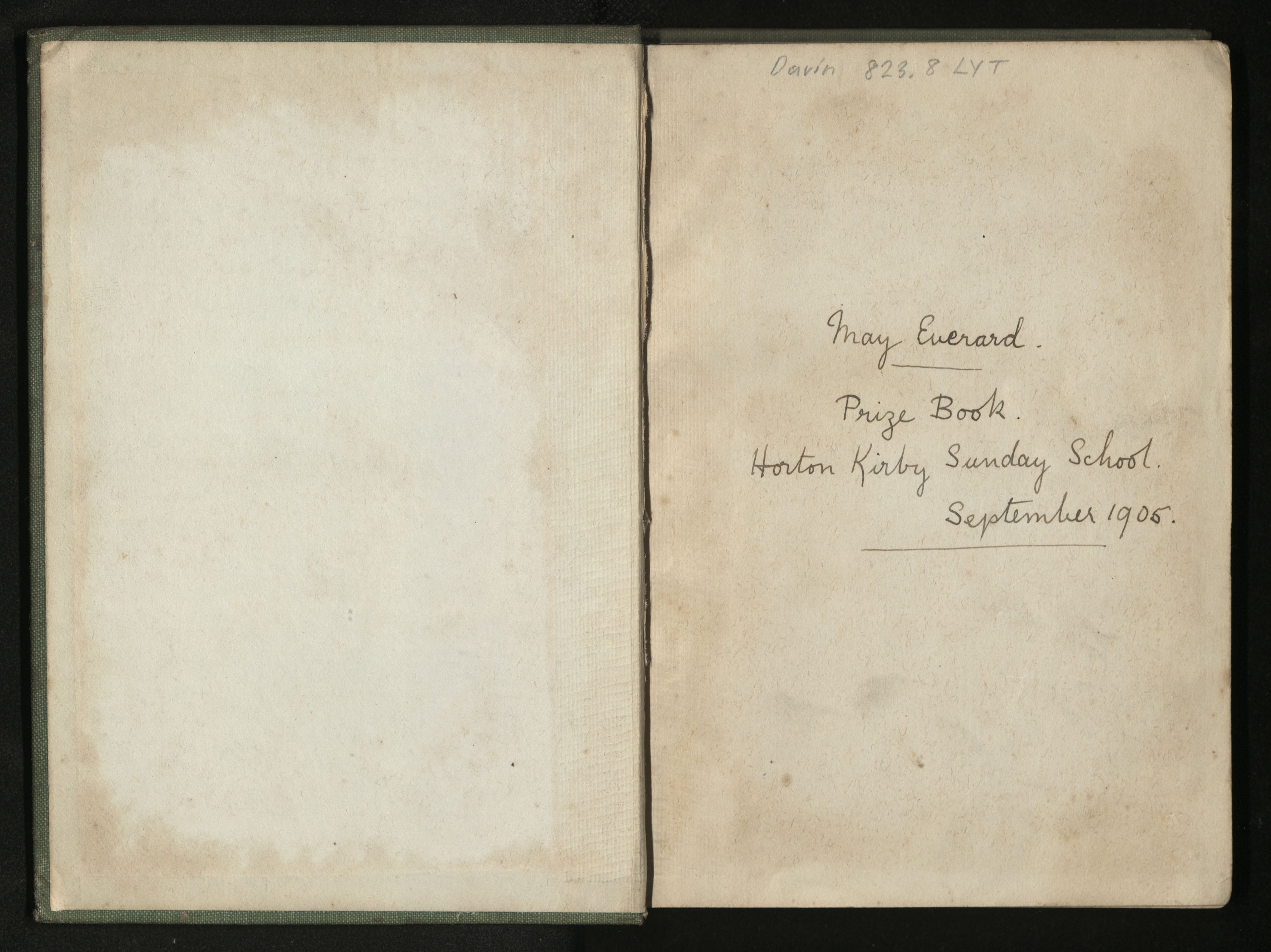 This work of fiction for children was given as a school prize approximately seven years after the book’s publication. The presentation inscription on the first front endpaper indicates that it was awarded to May Everard in September 1905, from Horton Kirby Sunday School. Horton Kirby is a village in Kent.