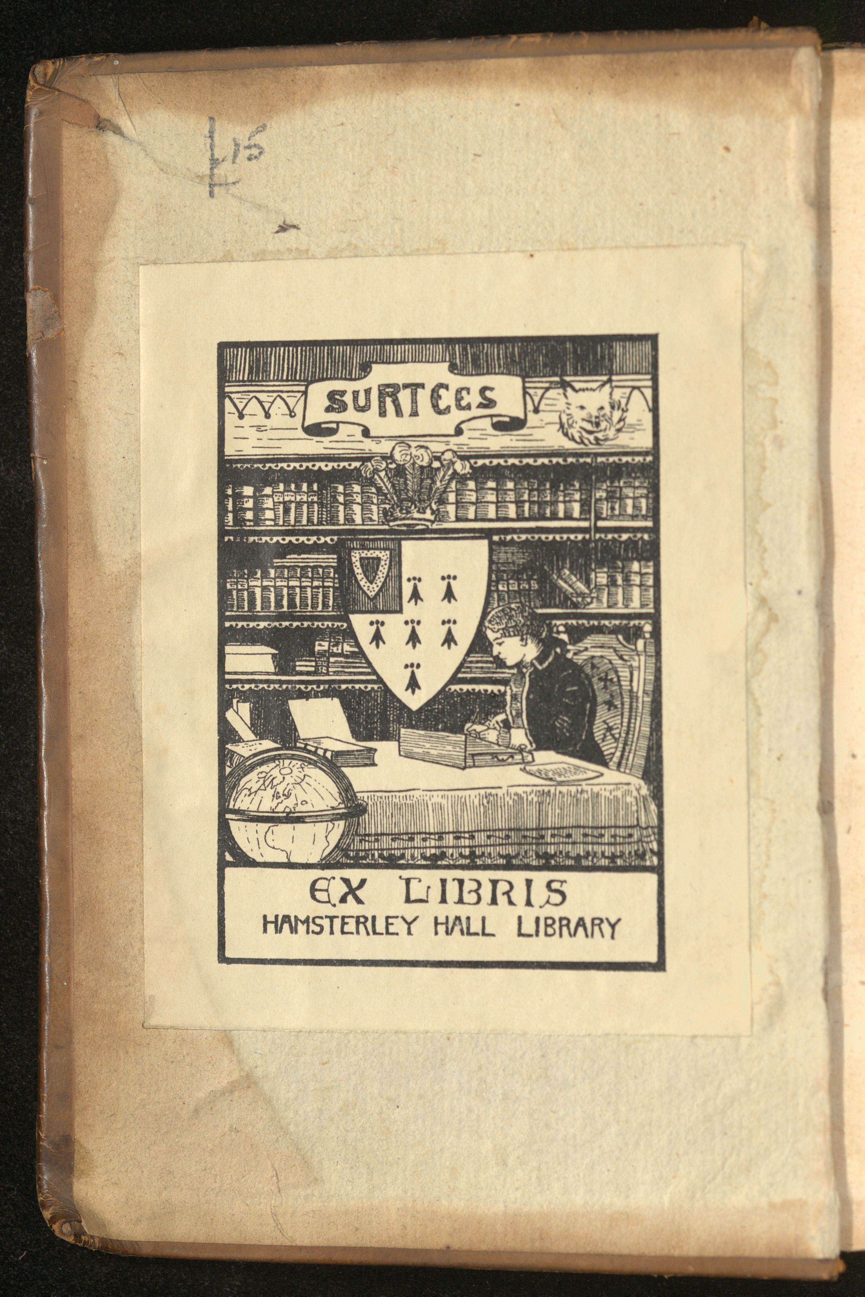 Here is the pictorial Ex Libris bookplate of Robert Smith Surtees (1805–1864) that also incorporates his coat of arms. Surtees was a novelist, editor, and sporting writer whose work influenced renowned writers such as Siegfried Sassoon, Evelyn Waugh, and Virginia Woolf. The bookplate depicts Surtees at his writing desk in the library. The fox’s head mounted on the wall reflects his keen interest in hunting. Before the book was owned by Surtees, it had an 18th century owner, Thomas Pulleyn, whose armorial bookplate is pasted onto page [ii].