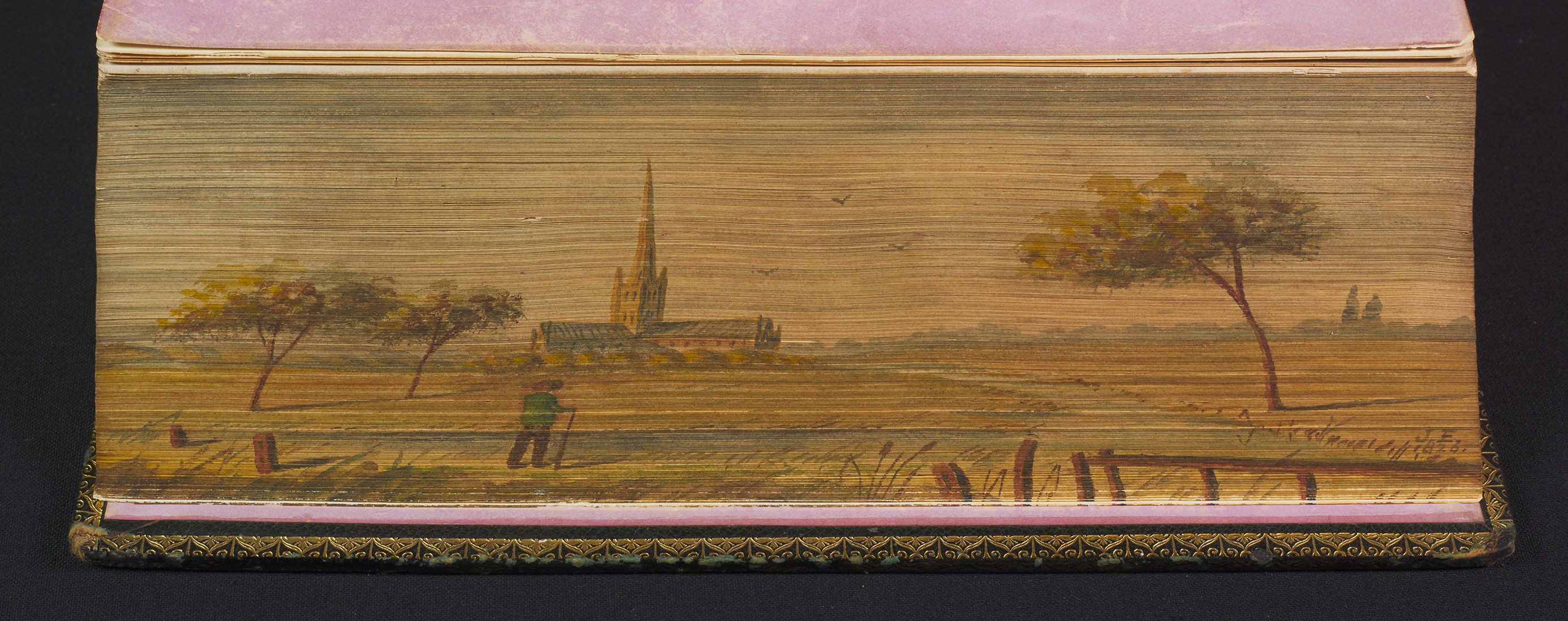 This book has a fore-edge painting depicting Salisbury Cathedral, which is signed J.E. 1826. It is signed “J.E.” to fraudulently suggest that it is the work of John Edwards of Halifax. The Edwardses of Halifax repopularised fore-edge painting 50 years after it had fallen out of fashion. They were among the most well-known booksellers at the time. However, as both John and his brother, James, were deceased by 1816, the 1826 date is false.