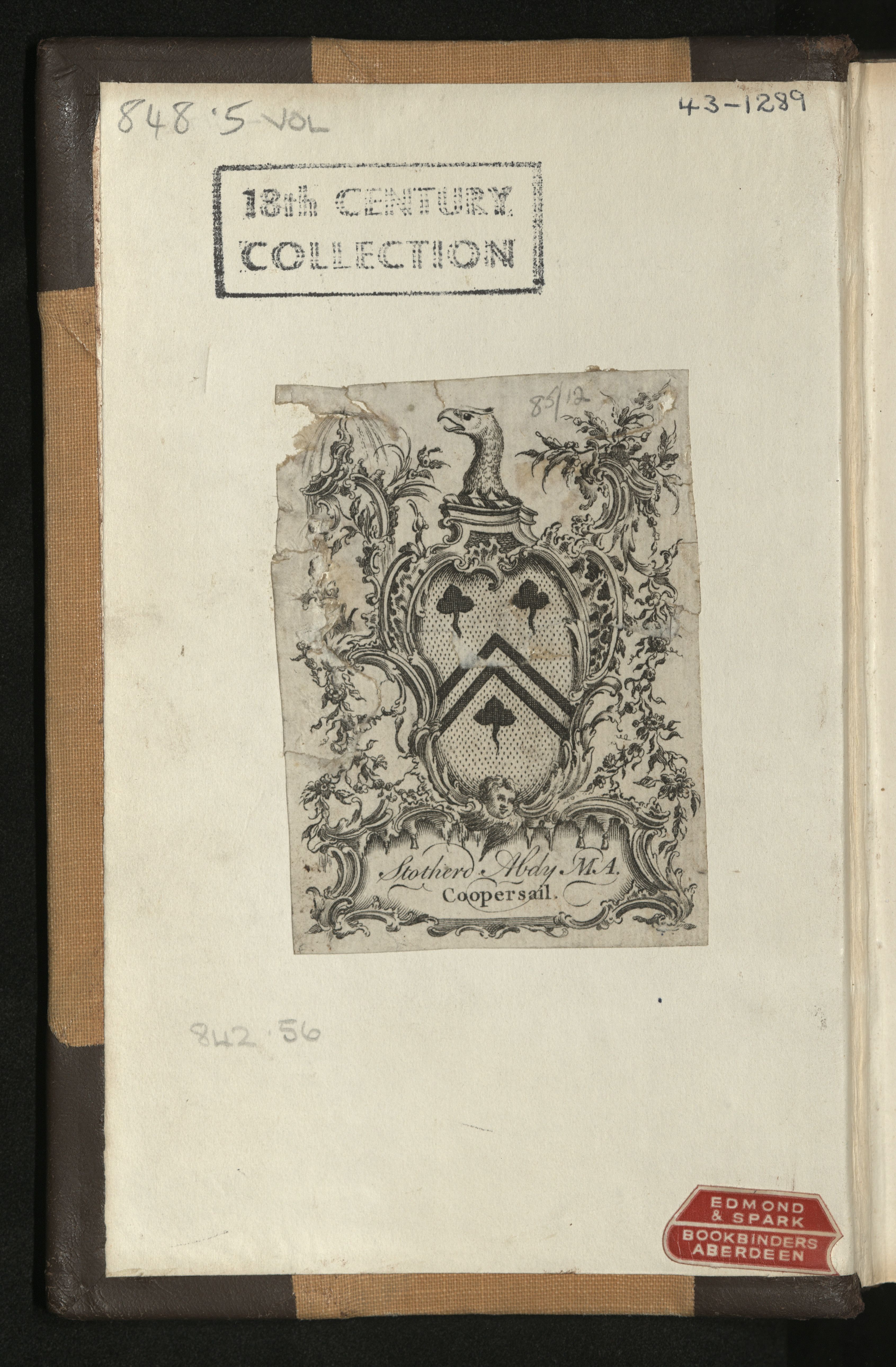 The front pastedown of this book has the armorial bookplate of Reverend Stotherd Abdy (1728–1773). Abdy was Rector of a church in Thaydon Garnons, Essex. The village is also known as Coopersale or Coopersail, as shown on his bookplate. Abdy married but left no heir. In 1775, two years after his death, his library was sold in a mixed sale in London, for fixed prices, by Samuel Baker and George Leigh.