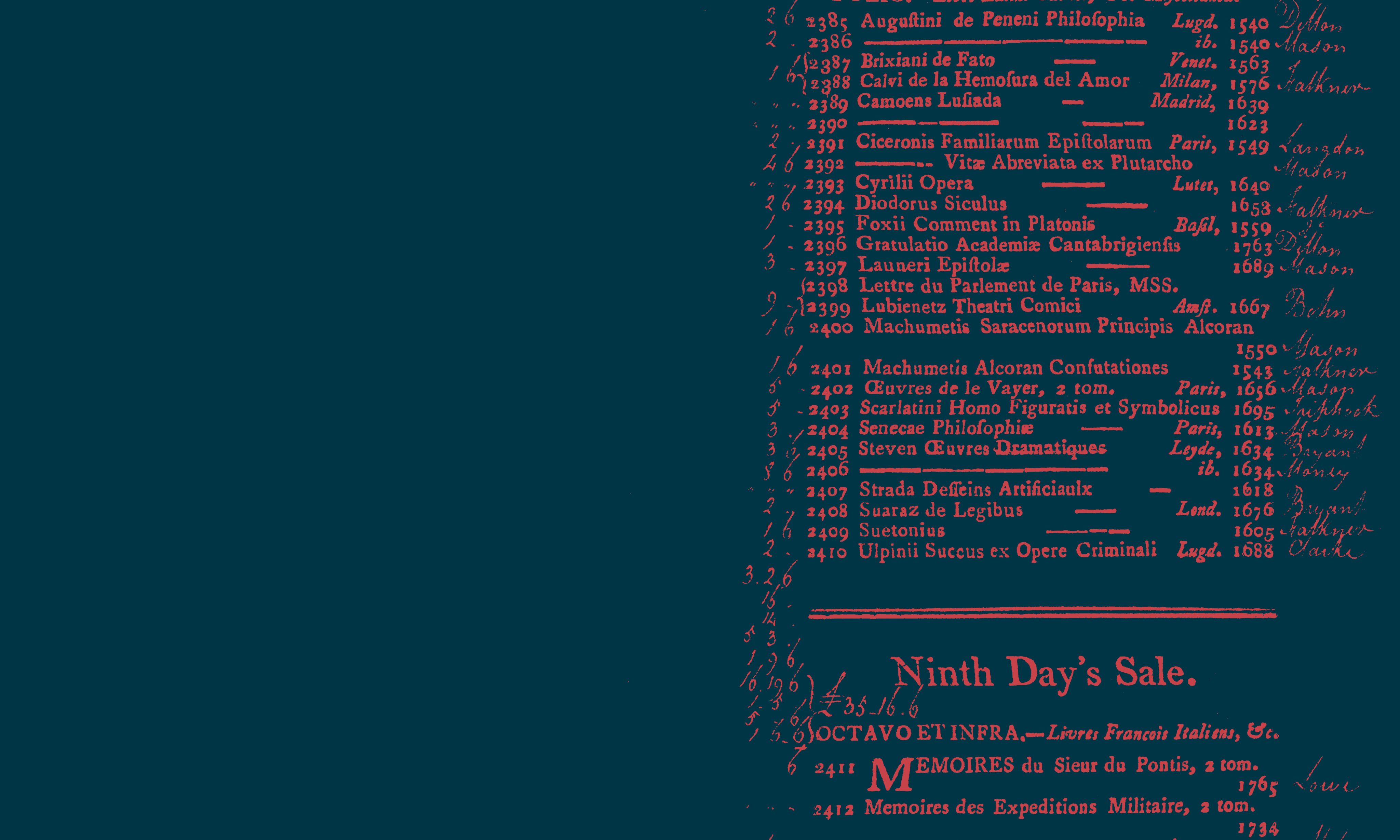 This item is a catalogue of books that were formerly owned by hydrographer (someone who measures and describes bodies of water) to the Admiralty, Alexander Dalrymple (1737–1808). The catalogue has been published by auctioneers King and Lochée, who were selling the library in 1809. This catalogue could be used to reconstruct Dalrymple’s now dispersed library and to inform research on the circulation of books. Tipped-in at the front of the book is a letter from Dalrymple in which he describes “old books” which he has recently purchased.