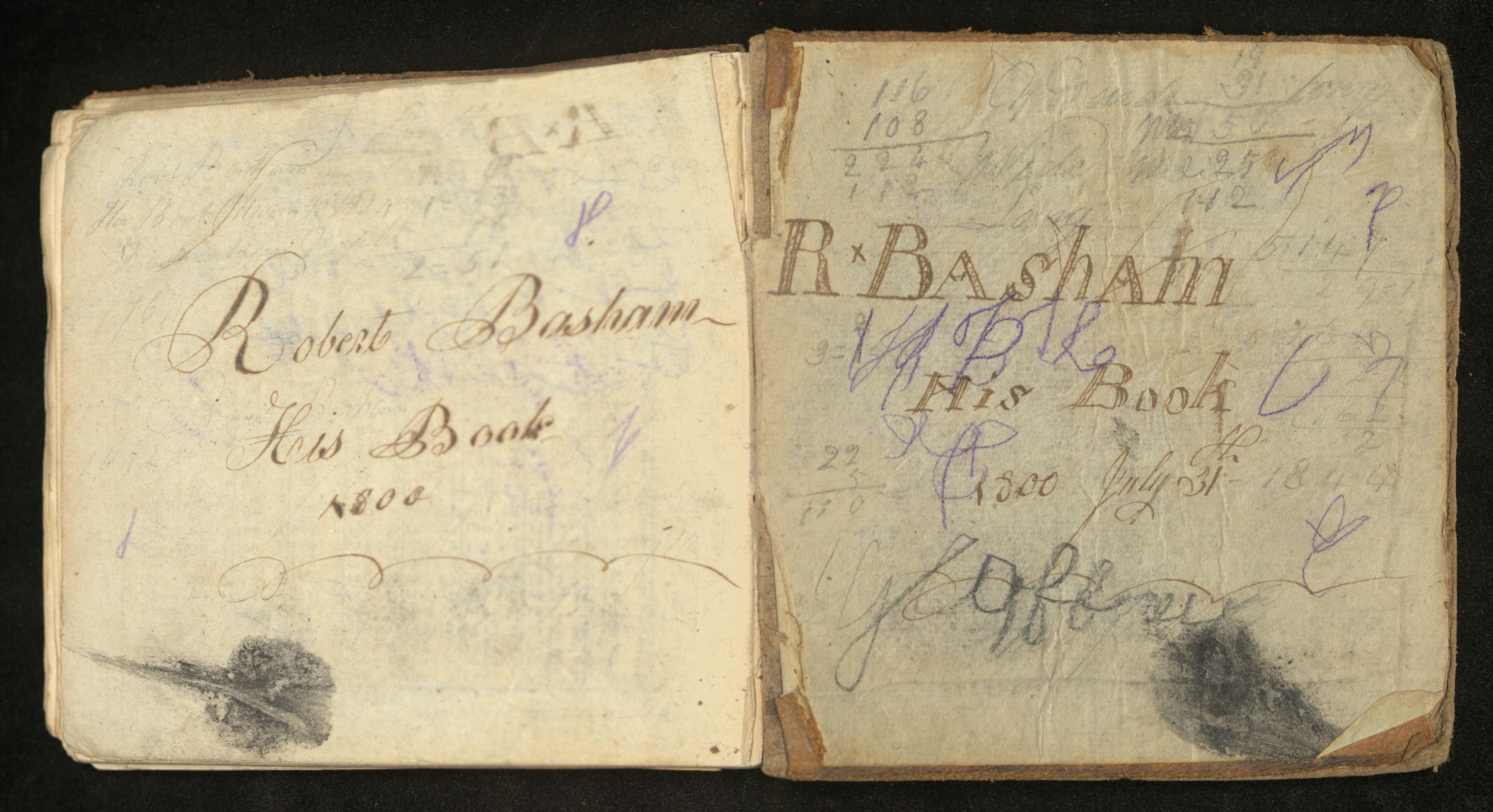 The first owner of this book has left their ownership marks in various styles and forms throughout the book. Here, it is open at the last rear endpaper and pastedown where Robert Basham states it is “his book”, inscribed in 1800. An inscription, in Robert’s hand, on the title page suggests the book was gifted to him by his father.