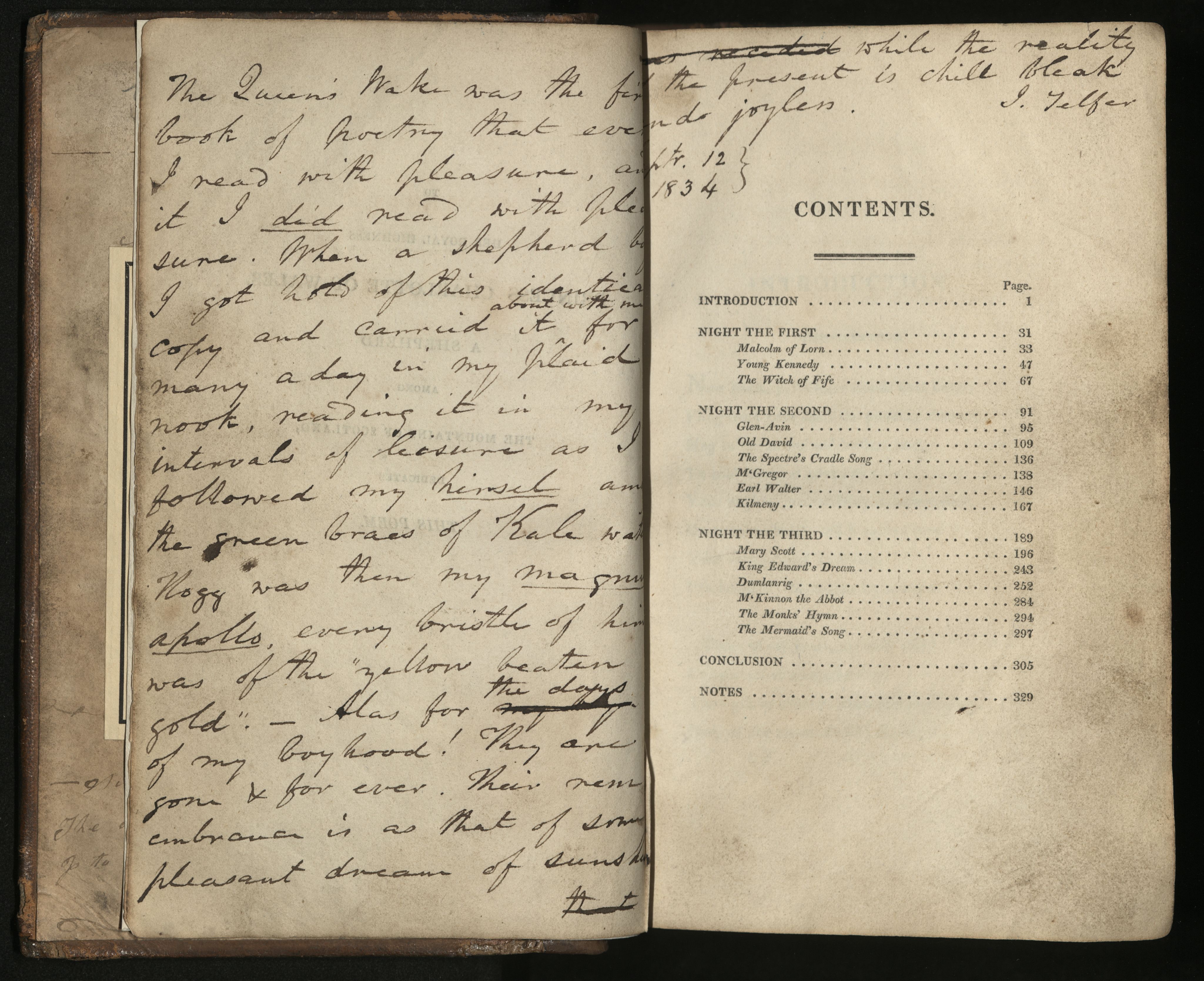 The author of this book is James Hogg (1770–1835), a self-educated shepherd and poet. He became known as ‘the Ettrick Shepherd’ after where he was born in Scotland. The book was previously owned by James Telfer (1800–1862): the front pastedown has a manuscript annotation in Telfer’s handwriting and the title page has the inscription ‘James Telfer, Saughtree School 1857’. Here we see a long annotation, signed by Telfer in 1834. Telfer was another self-educated Scottish poet who started life as a shepherd. He describes this book as the first book of poetry he read with pleasure and how he carried a copy with him as he followed his flock of sheep.
